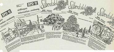 unsere Absicht, um in der Diskussion bessere Lösungen zu erreichen. Unsere Verbundenheit mit dem Ort zeigten wir dadurch, daß wir Artikel über die Heimatgeschichte veröffentlichten. Von unserer Vereinsarbeit berichteten wir unter dem Titel: SPD am Ort. Manches läßt sich in Mundart treffender sagen, deshalb lassen wir den Heiner und den Frieder über örtliche Angelegenheiten "schwäddsen". Die Schreiber und Zeichner der "Silberdistel", alles Mitglieder des Ortsvereins, werden auch weiterhin das Blättle interessant gestalten und wie die Silberdistel stupfen und stechen.